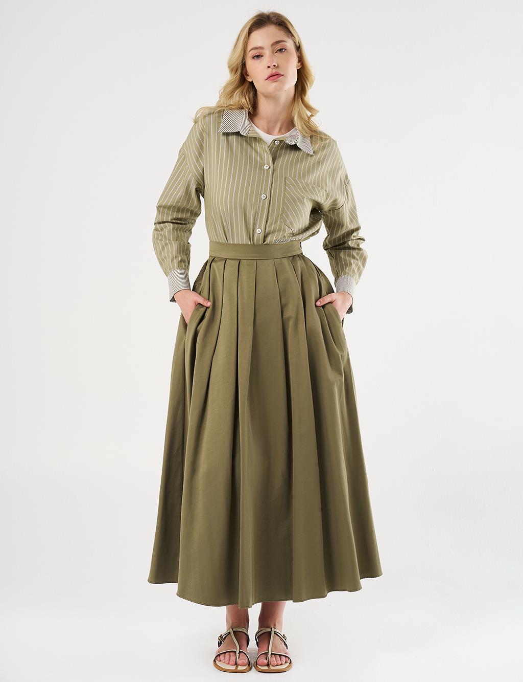 Kayra High-Waisted Pleated Skirt combines elegance and sophistication. The high waist design accentuates the waistline, while the pleated details add grace to the skirt. For the perfect look, you can pair it with basic shirts and tunic