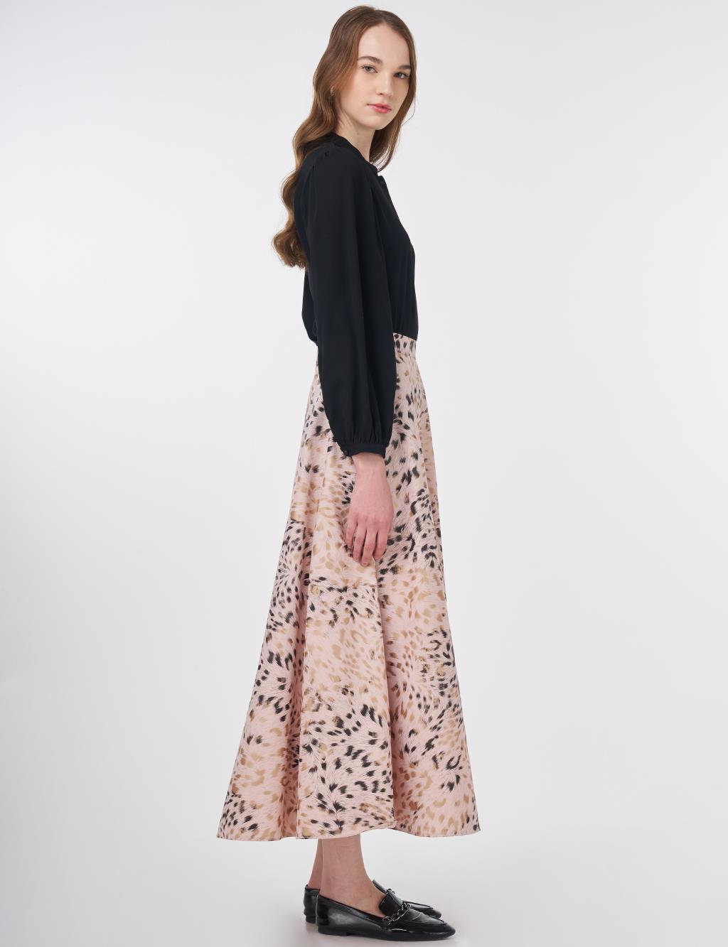 The Kayra Leopard Print Flared Skirt offers a flawless silhouette with its tailored design. Perfect for both office and event styles, you can effortlessly pair it with a basic tunic, blouse, earrings, or accessories to create a well-coordinated look.