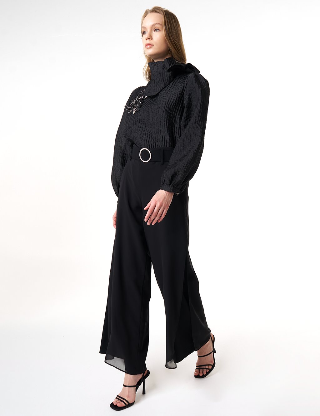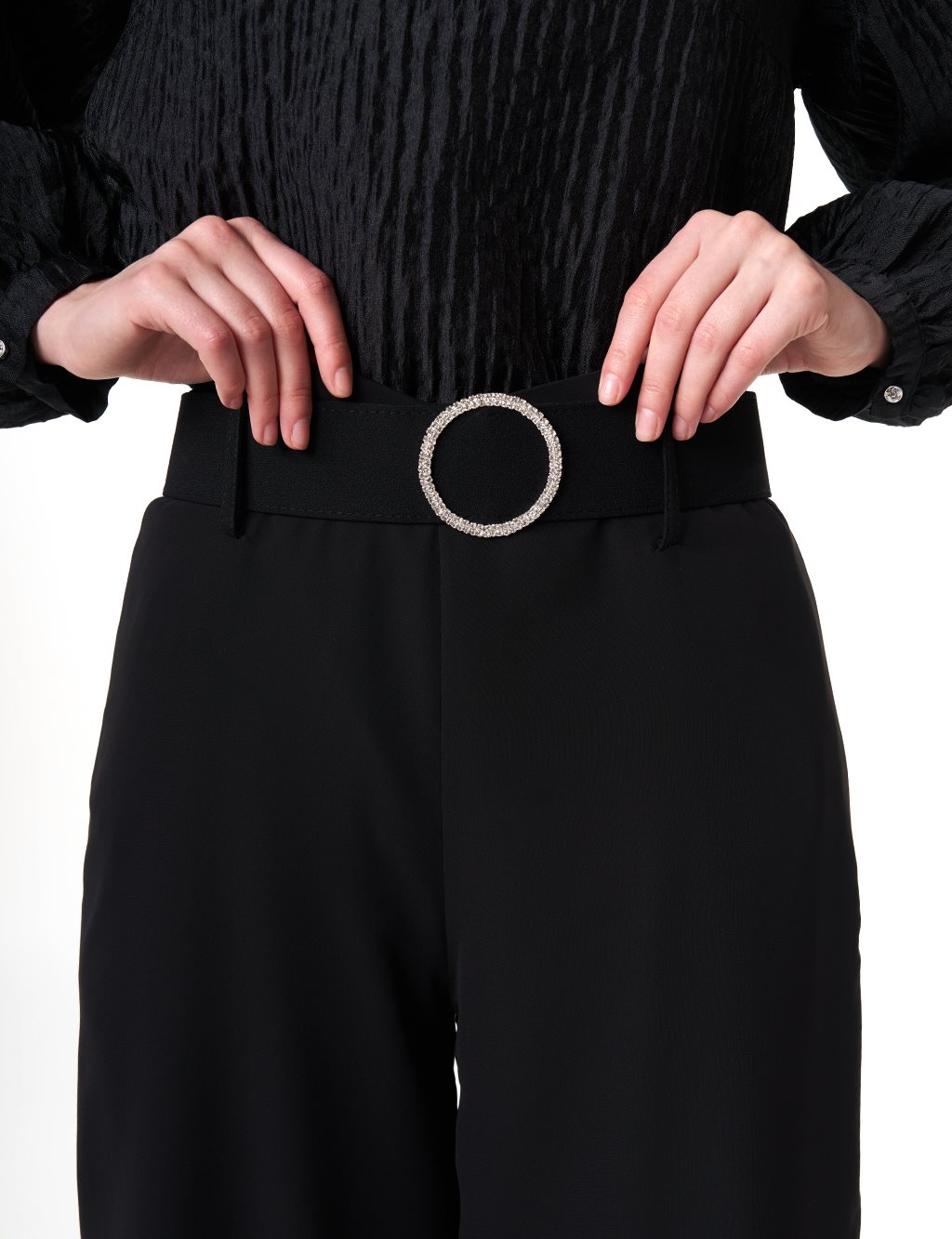 The Kayra Metal Buckle Detailed Crepe Pants stand out with their comfortable and stylish design. Ideal for events or special occasions, these pants can be paired with blouses  and earrings for an elegant look. Completed with a removable buckled belt, this design is sure to become a staple in your wardrobe.