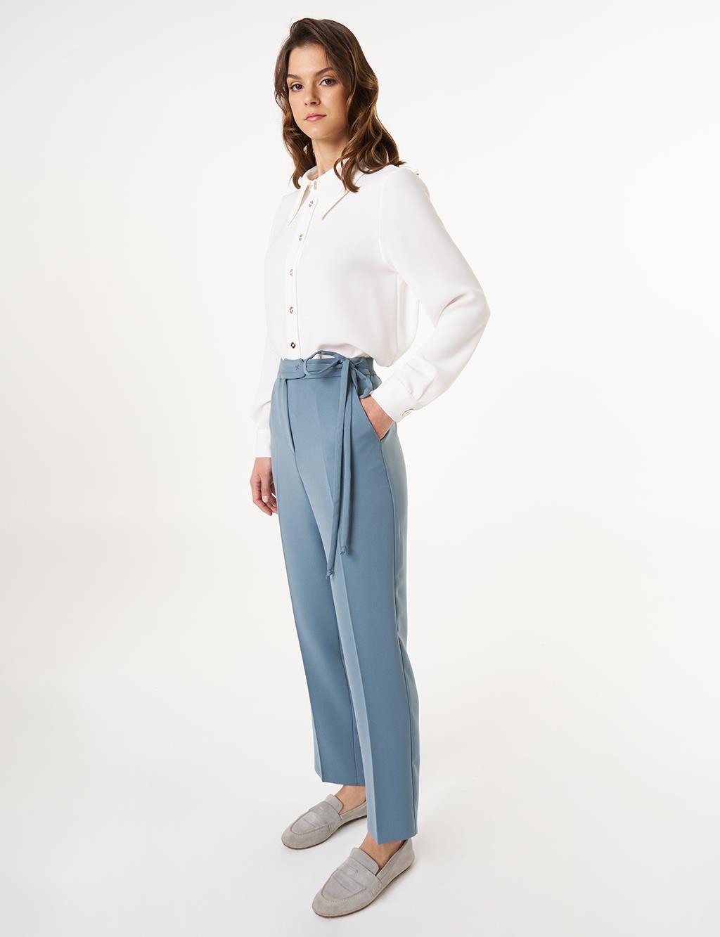 The KYR Pressed Crease High Waist Trousers elevate your style with their sleek pressed lines. Designed with a side tie for a modern touch, these trousers are ideal for seasonal transitions. Pair with a blazer for a polished, sophisticated look. You can complement your outfit with basic shirts or blouses.