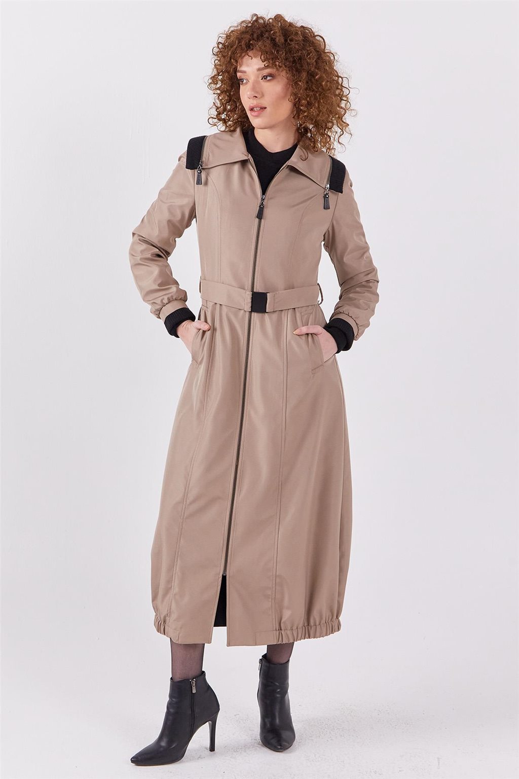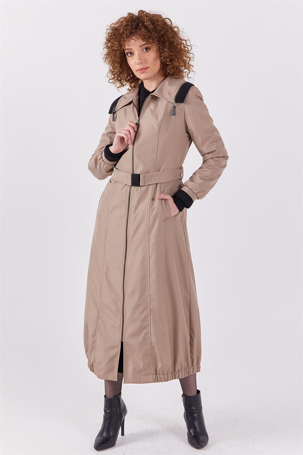 The Zippered Coat, with its modern cut and zipper details, enhances your style. It keeps you warm on cold days while offering practicality with functional pockets. An ideal outerwear option for chilly weather, this design can be paired with knit tunics, knit sweaters, pants, or accessories.