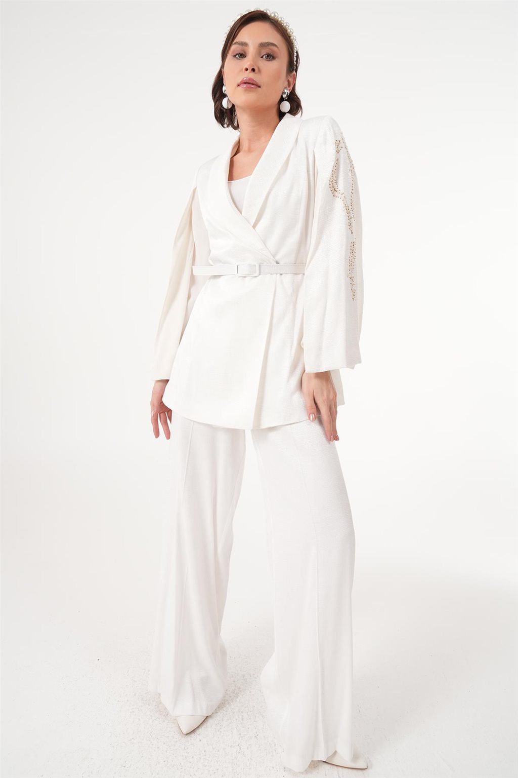 Shawl collar, detachable belt, slit sleeves with bead embroidery, lined jacket. Regular waist, zipper and button closure, lined trousers. This is a two-piece set consisting of a jacket and trousers.