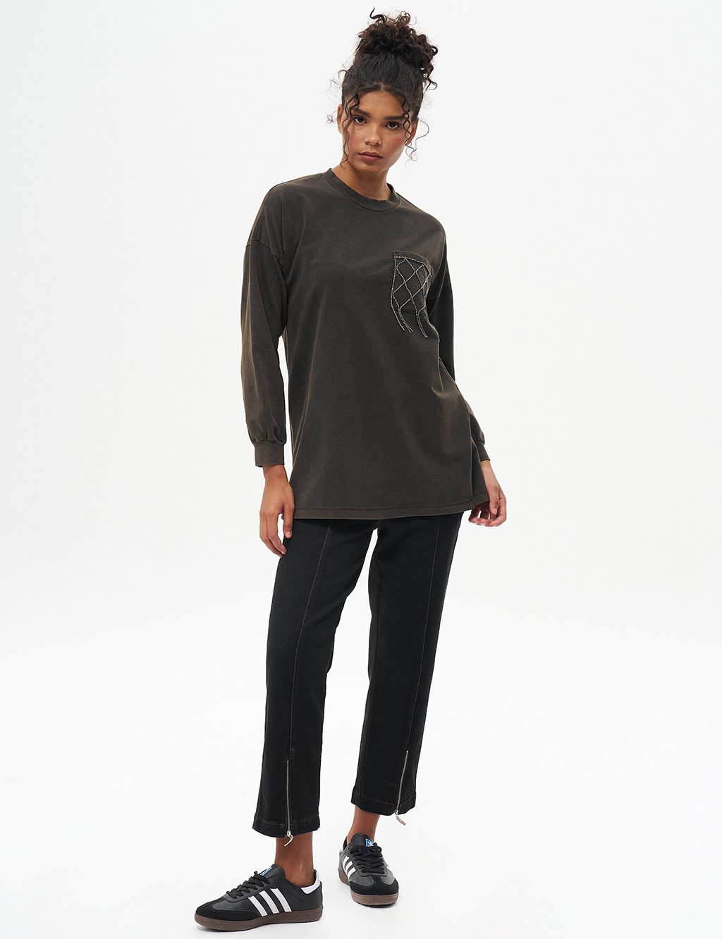 The Kayra Stone-Embroidered Two-Ply Sweatshirt stands out with its elegant stone details. Its soft and comfortable fabric offers ease for daily wear, while its stylish design ensures a modern look in any setting. You can achieve the perfect look with pants, denim, or accessories.
