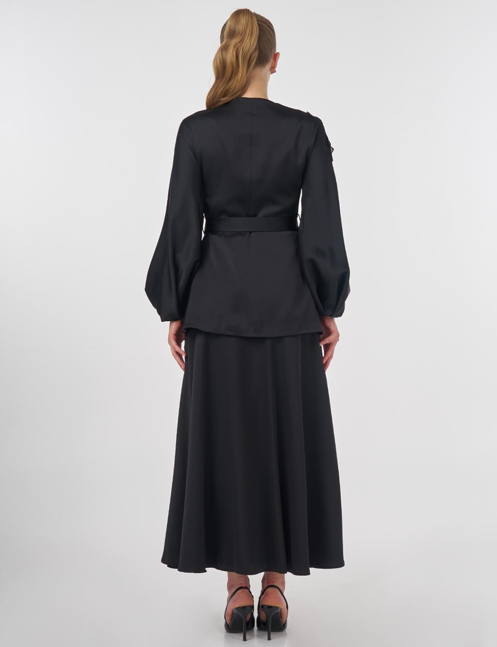 Crew neck jacket with snap fastener closure, balloon sleeves, removable embroidered belt, embroidered appliqué, and lining. High-waisted skirt with side zipper closure and lining. This is a two-piece set consisting of a jacket and a skirt.