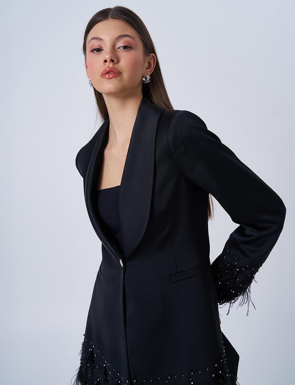 Shawl collar, embellished with stones and ostrich feathers, welt pockets, lined blazer. High-waisted pants with button and zipper closure, and pockets. This is a two-piece set consisting of a blazer and pants.