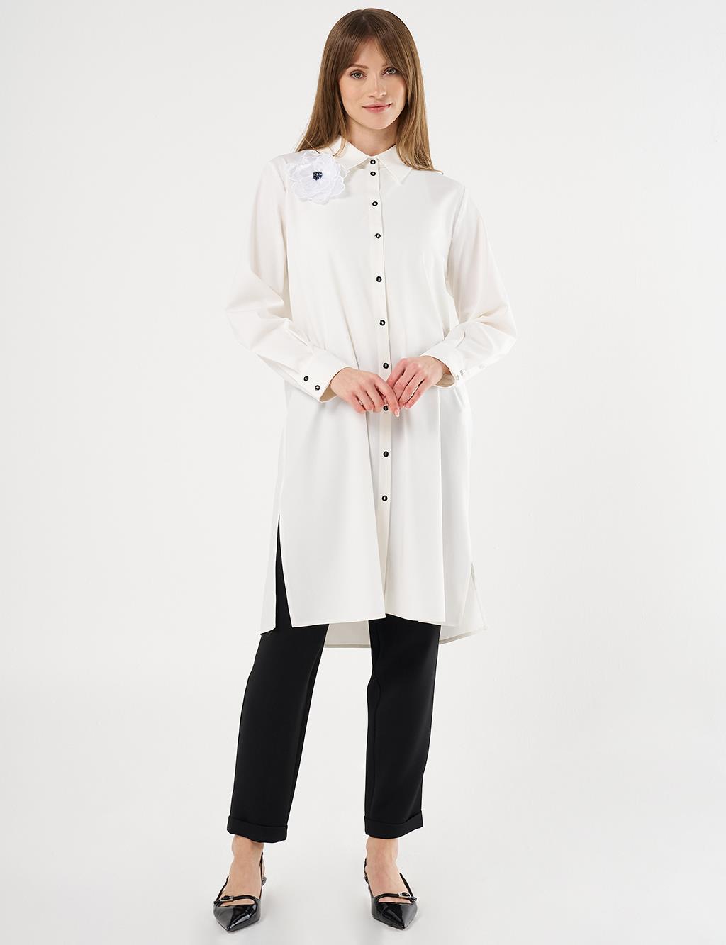 The Kayra Long Tunic with Floral Appliqué stands out with its elegant details. Its relaxed fit and long silhouette make it suitable for both office wear and special occasions. For a refined look, pair it with tailored pants, earrings, or a bag.