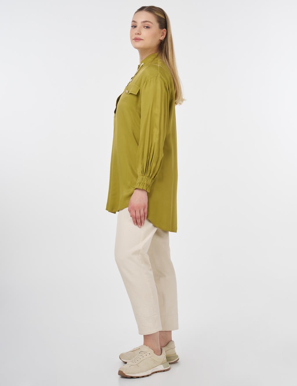 The Kayra Flap Pocket Stand-Up Collar Tunic is made from a viscose fabric blend. A favorite piece in basic styles, this tunic is perfect for transitional seasons. It can easily be adapted for daily wear, office outfits, or weekend looks when paired with trousers, denim, earrings, or other accessories.
