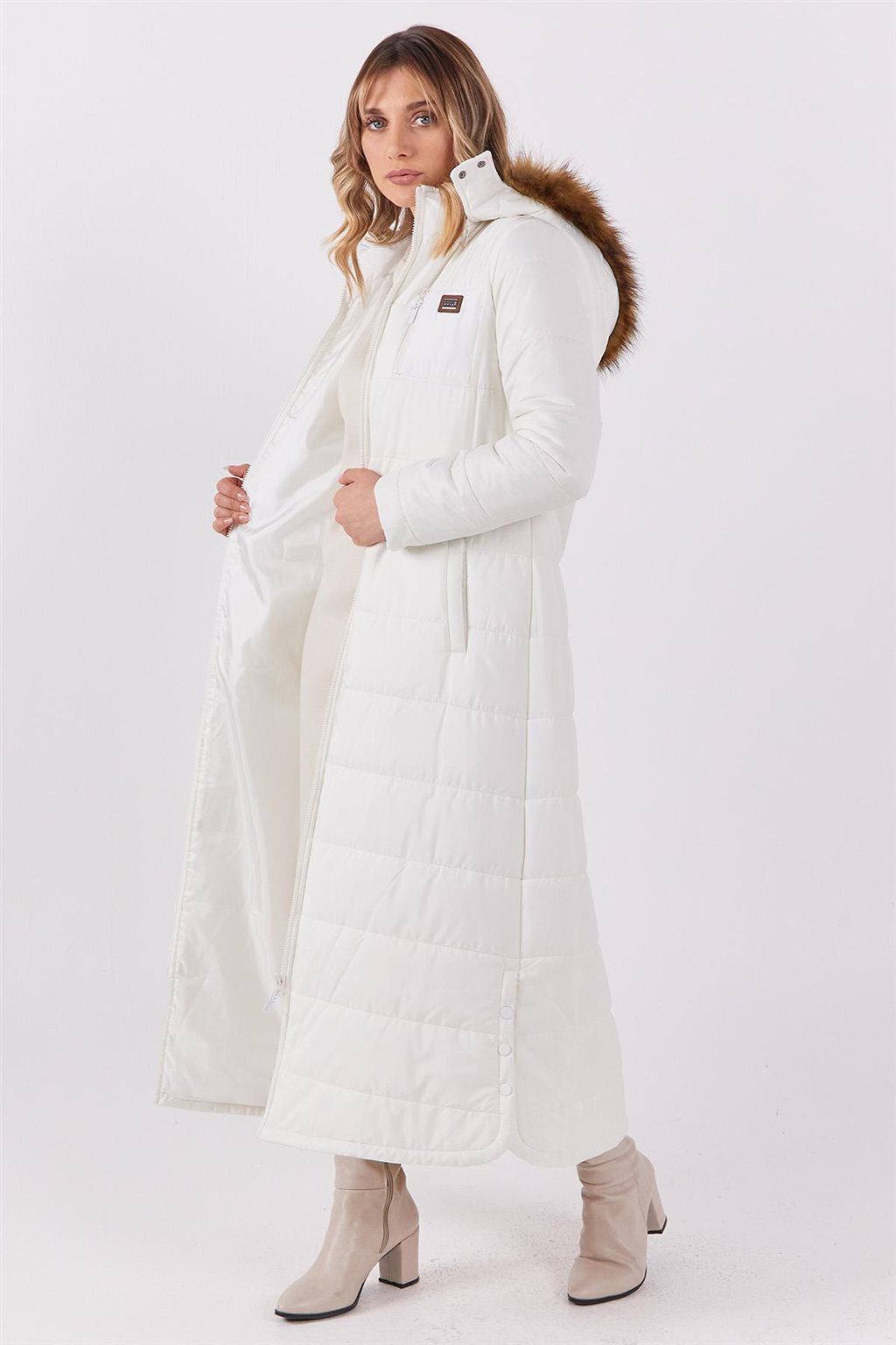 Suni Kürklü Kapüşonlu Anorak Mont Optik Beyaz