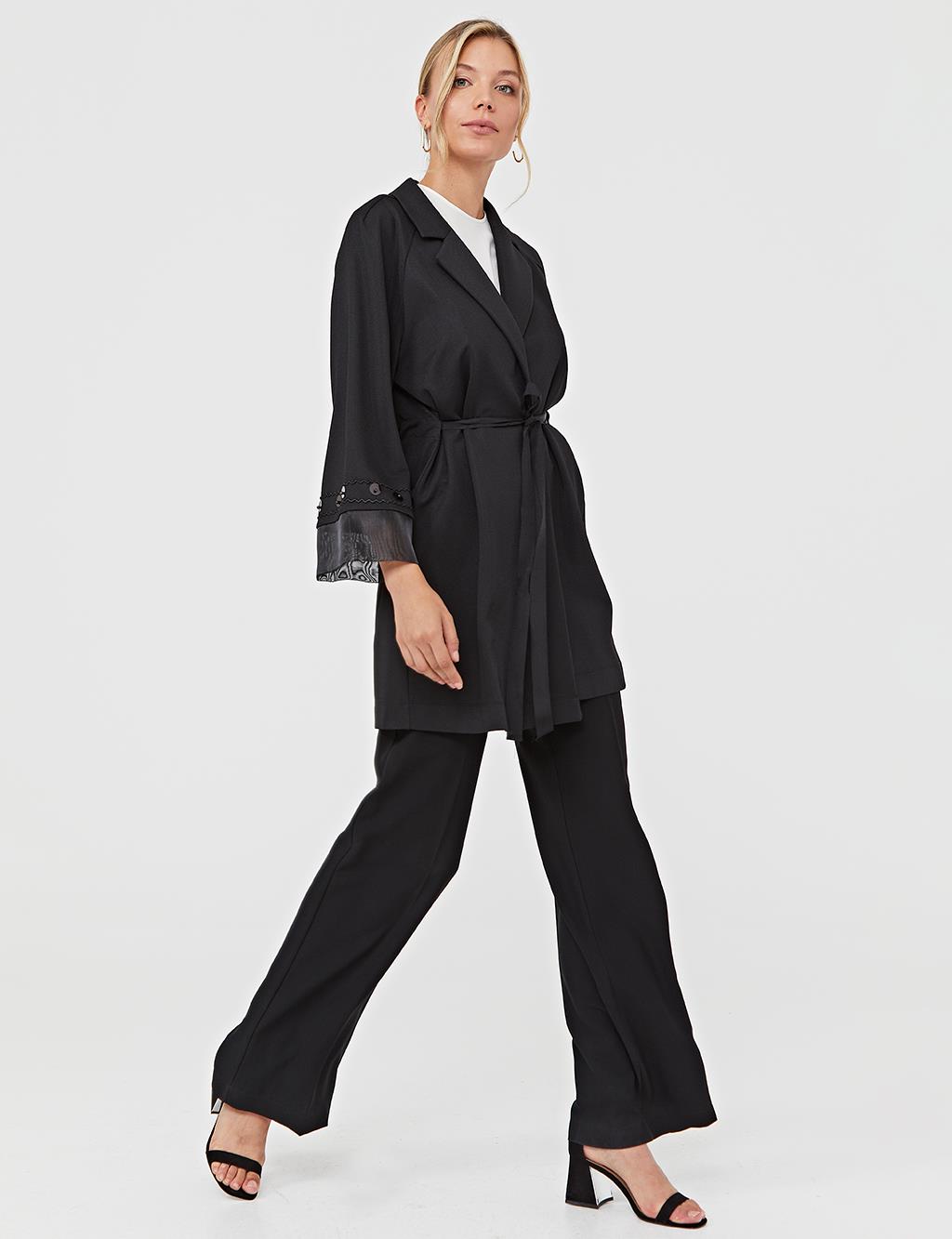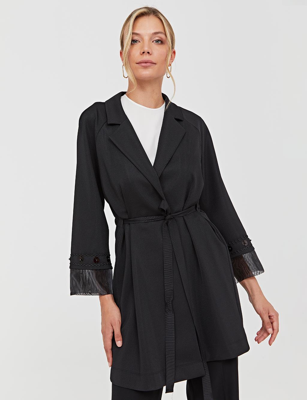 Kruvaze yaka, reglan kol, ekstrafor kemer, kol ucu organze ve kol kenarları işlemeli, truvakar kol ceket.