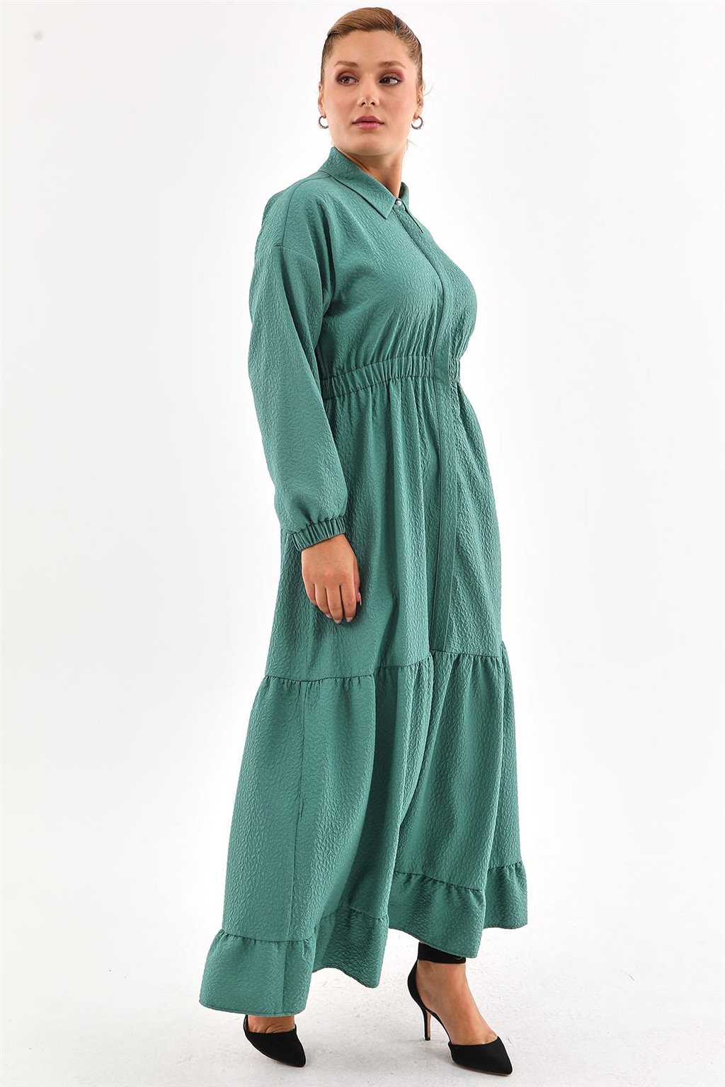Katlı Rölyef Desen Elbise Göl Yeşili