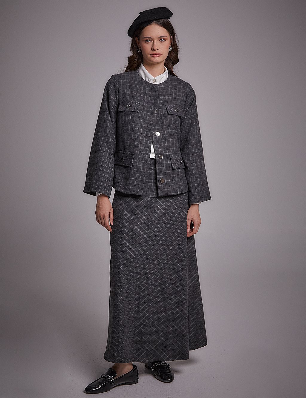 Kayra Kareli Evaze Etek, adeta dönem filmlerinden esinlenmiş stili ile dikkat çekiyor. Maskülen görünüme hakim olan eteği, gömlek, ceket ve bluzlarla kombinleyebilir, ofis, davet ve hafta sonu giyimi için tercih edebilirsiniz. Düğmeli formu sayesinde kullanım kolaylığı sağlıyor.