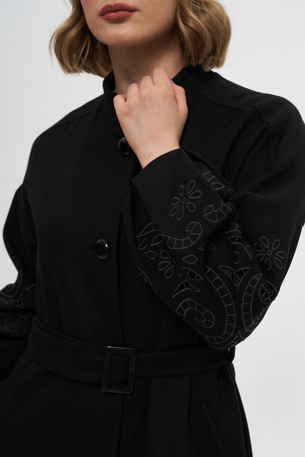 Nakışlı Lazer Kesim Düğmeli Kaban Siyah